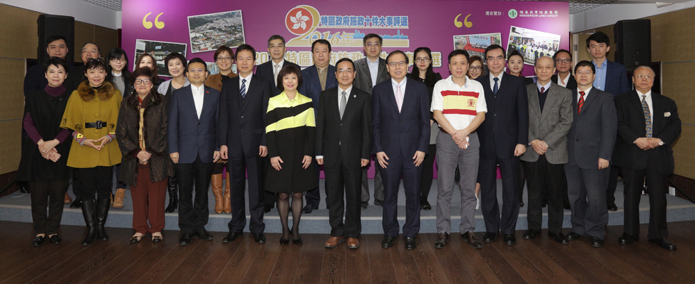 特区政府施政十件大事评选于1998年由香港文汇报与九龙总商会联合发起举办,至今已是第19届。今届共有24家传媒机构主办、65个团体协办、100多间学校参与。昨日,莅临主礼的中联办宣传文体部副部长李海堂,与多名主办及协办机构代表一同见证结果出炉,并进行抽奖仪式。
