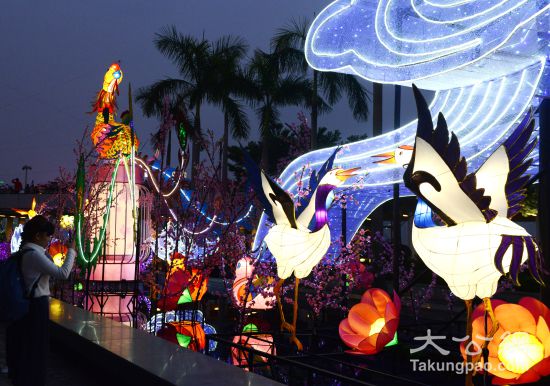在桃花池畔凤求凰彩灯展上,五彩凤凰与一众灵鸟飞翔于桃花之间的情景,寓意丁酉鸡年天下有情人两情相悦,幸福美满。