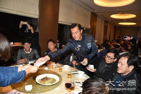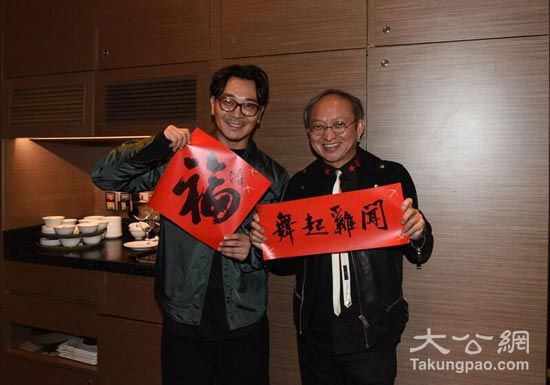 席间古仔更化身财神,手持厚厚的五百元纸币,亲自走到每张枱派钱,连投资方及演员都人人有份,他搞笑说:我不入利是封了,直接派环保又不用拆。当晚筵开九席,粗略估计古仔一共派超过五万元现金,绝对皆大欢喜。古仔派钱,戏中另一男主角吴樾则大派祝福,他亲自写了一批挥春,派给在座每位工作人员。