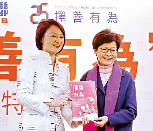 大公网2月5日讯(记者 郑治祖)特首选举提名期将于本月14日开展,各特首参选人正积极约见不同选委,争取提名支持。特首参选人、前政务司司长林郑月娥昨日出席了民建联首场与特首参选人座谈会。民建联主席李慧琼赞扬,林郑月娥的好打得并非一朝一夕练成的功夫,而是经木人巷训练和长期浸淫,又赞扬对方即使很忙也会认真回覆市民意见,形容她是学习的榜样。林郑月娥则表示,自己日前提出的施政范畴,初步与民建联的意见吻合,即要多元发展香港经济、全面检视香港的教育制度及加大力度开拓土地、加快兴建房屋。她会充分考虑民建联对下届特首的期望。