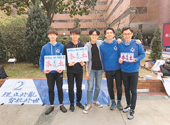 理大学生会干事会候选内阁理贤公然煽动暴力。图为本周三,同属独庄的城大学生会会长陈岳霖(中)、内务副会长罗翘现(左二)到理大校园为理贤内阁拉票。