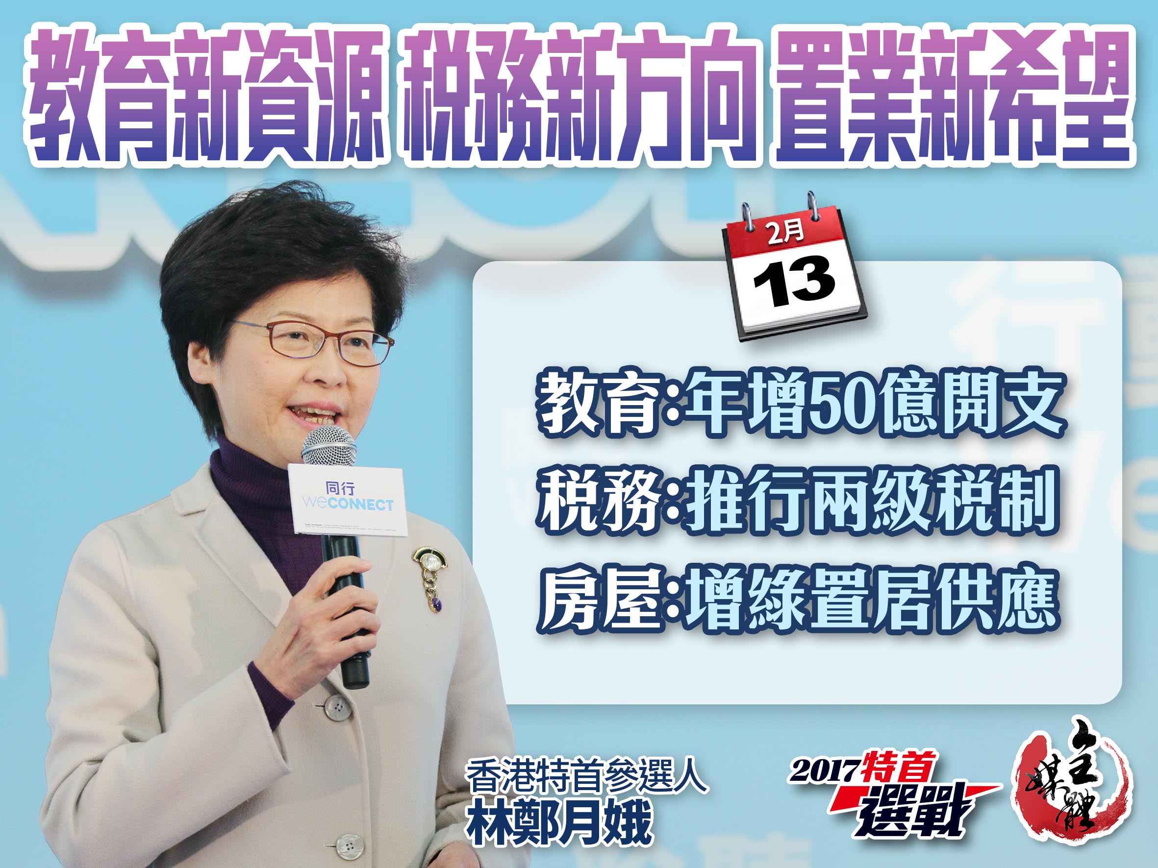 大公网2月14日讯 第五届行政长官选举的提名期今日开始至三月一日结束。行政长官选举参选人、前政务司司长林郑月娥昨日在尖沙咀街坊福利会礼堂举行的与你同行:政纲第二步记者会中,发表初步政纲,提出三个新方向,包括教育新资源、税务新方向、置业新希望。