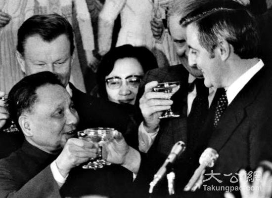 邓小平(左)出席中美晚宴,费斐(后)为之翻译。资料图