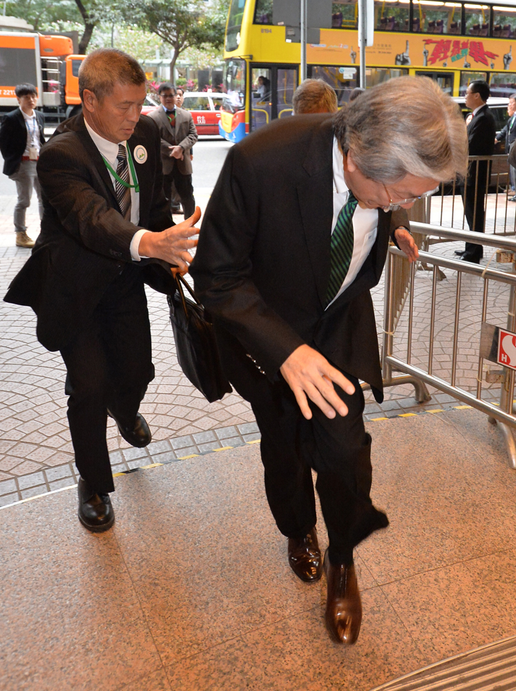 图:曾俊华昨日突然抢先报名,进入选举事务处前差点摔倒