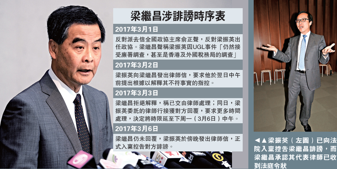 至公网3月7日讯(记者 冼国强)否决派大举炒作UGL事务,管帐界立法员梁继昌日前更颁发疑似离间特首梁振英,未提出就声称对方就UGL事务正受喷鼻港及外国税务局查询造访如此。特首办昨日证明,梁振英已向法院入禀立法员梁继昌离间。梁继昌立即作出回应,但认可其代表状师已收到法庭令状,会于昨天(3月7日)交接事务。