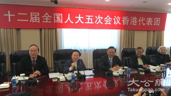 国务委员杨洁篪(中)昨日出席港区天下代表团审议事情的小组。至公报记者许嘉信摄