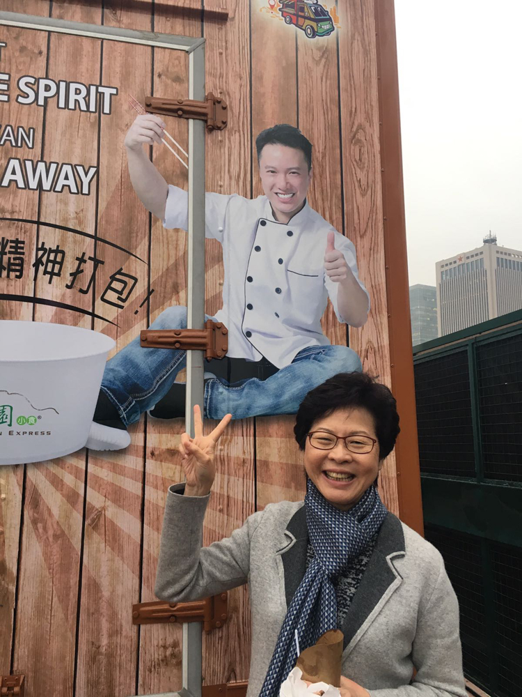 图:林郑月娥获邀请到印有豪园小食档主肖像的摄影纪念,促成一张隔空合照\豪园小食供给