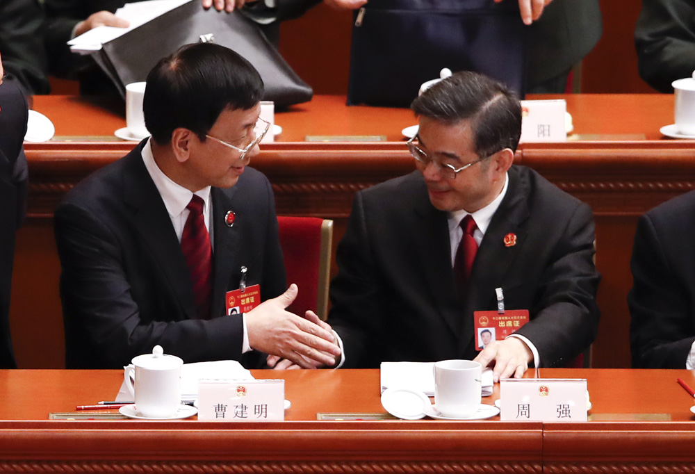 图:12日,十二届天下五次举行第三次整体味议,听与最高人平易近法院院幼周强战最高人平易近查察院查察幼曹筑明,会后周强(右)战曹筑明握手/中新社