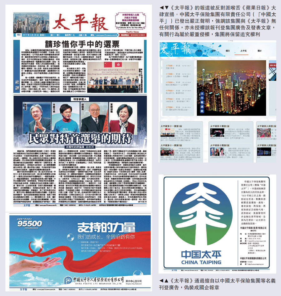 至公网3月13日讯(至公网记者 龚学鸣 汪子文) 特首推举邻近,否决派为混合视听,无所不消其极!一份名为《承平报》的通过私行以中国承安然全集团等表面告白,伪装成国企,被否决派《》大举张扬。中国承安然全集团无限义务公司(中国承平)昨日发出严明声明,明白暗示,该集团与《承平报》无任何相干,亦未授权该报集团告白及颁发文章,相关举动属于紧张侵权,集团将保存。中国承平又夸大,任何暗射及表示该集团与《承平报》相关的举动均属性宣传。《至公报》亦发觉,相关告白自客岁八月才起头,伪装散谣的举动早有摆设。