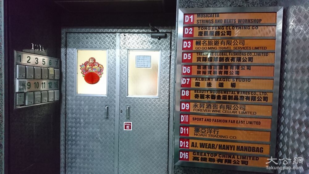 当达到12楼时,记者发觉D室分租为十多间办公室,有木器、洋行及学邪术园地。而每间办公室均有门铃。不外,位于D6的致裕商业无限公司,门铃贴着通告,如D6没人请找D12,同时D12则写着请迎D8室代收D12邮件。D12为AJ.WEAR/HANYI HANGBAG;D8则为奇艺木器金属製品厂无限公司。