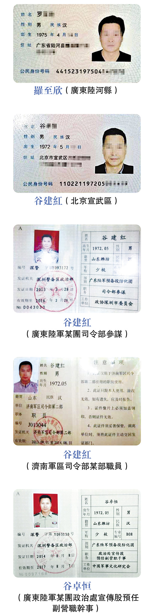 谷正在一张军官证中的身份是谷卓恒,为广东陆军某团预任副营职作事,正在另一张军官证上则酿成了谷筑红,职务也酿成广东陆军某团司令部顾问。另有一张签名谷筑红的戎行人员证中,却显示其是济南军区司令部某部人员。