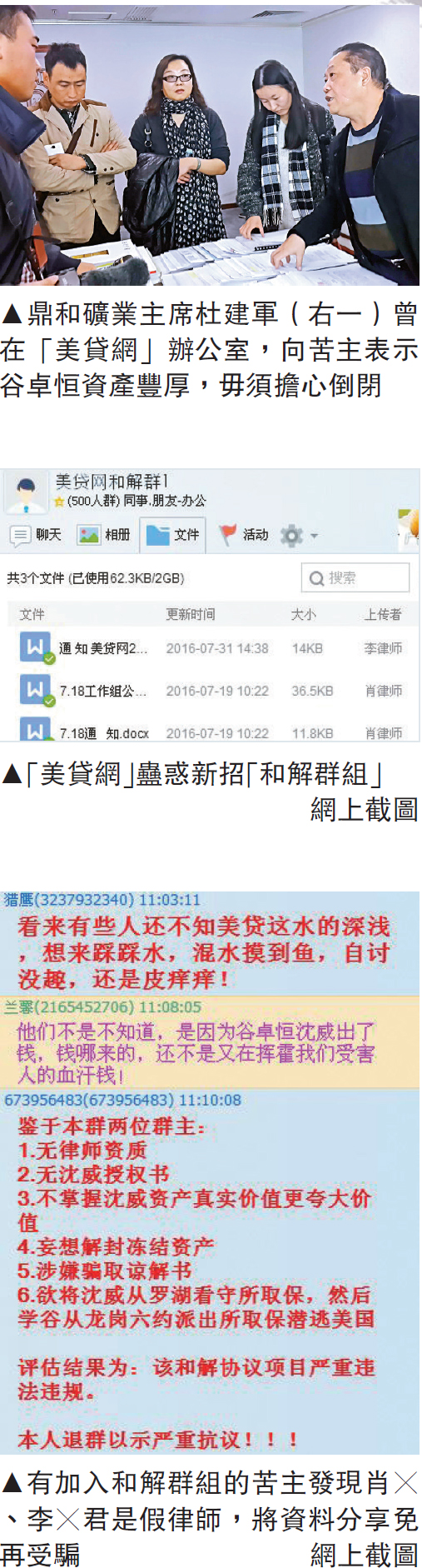 美贷网爆煲后,再用假状师出招骗苦主息争,图解封旗下资产。美贷网法人代表谷卓恒老婆沈威自客岁被深圳警方后,大量苦主俄然接到了自称是代表沈威的状师来电,游说苦主插手一个息争的QQ群组或者微信群组,声称商谈补偿事宜。但有苦主暗示进入该群组后,发觉该两名自称代表沈威的状师居然没有状师证,也没有沈威的委託书,苦主置信又是美贷网的勾引手法:他们但愿苦主签写原谅书,既能够沈威,又能将‘美贷网’查封冻结的资产解冻,以便变卖兑隐,捲走资金。/至公报记者 石华深圳报道