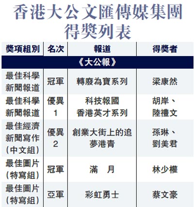 正在最佳科学旧事报道组此外五个项中,《至公报》战《文报告叨教》双剑合璧,为集团囊括一金一银两优异共四个项,此中以《至公报》记者梁康然所撰写讲述本港厨余收受接受面临问题的转废为宝系列共三个专版,独占鳌头;而《文报告叨教》记者郑伊莎、任智鹏、欧阴文倩、姜嘉轩、吴希雯及黎忞等的AI新时代系列夺亚军。别的两个优异,别离由《至公报》的科技报国 喷鼻港英才系列,及《文报告叨教》的邵逸夫系列与得。