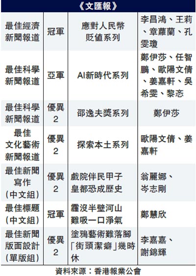 同时,正在最佳经济旧事报道组别,《文报告叨教》的应答人平易近币贬值系列获颁冠军;亦凭〈霾没半壁山河难吸一口脏气〉得到最佳题目(中文组)冠军。别的,《至公报》孙琳、刘美君所写的《创业大街上的追梦港青》获最佳经济旧事写作(中文组)优异;《文报告叨教》摸索本土系列获最佳文化艺术旧事报道以及以《戏院伴平易近甲子 皇都恐成汗青》获最佳旧事写作(中文组)优异。