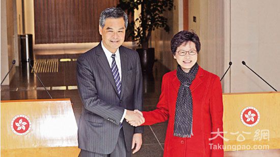 图:行政长官梁振英(左)昨日外行政长公室取下任行政长官被选人林郑月娥(左)会晤,梁振英奉上恭喜 大公报记者 林少权摄