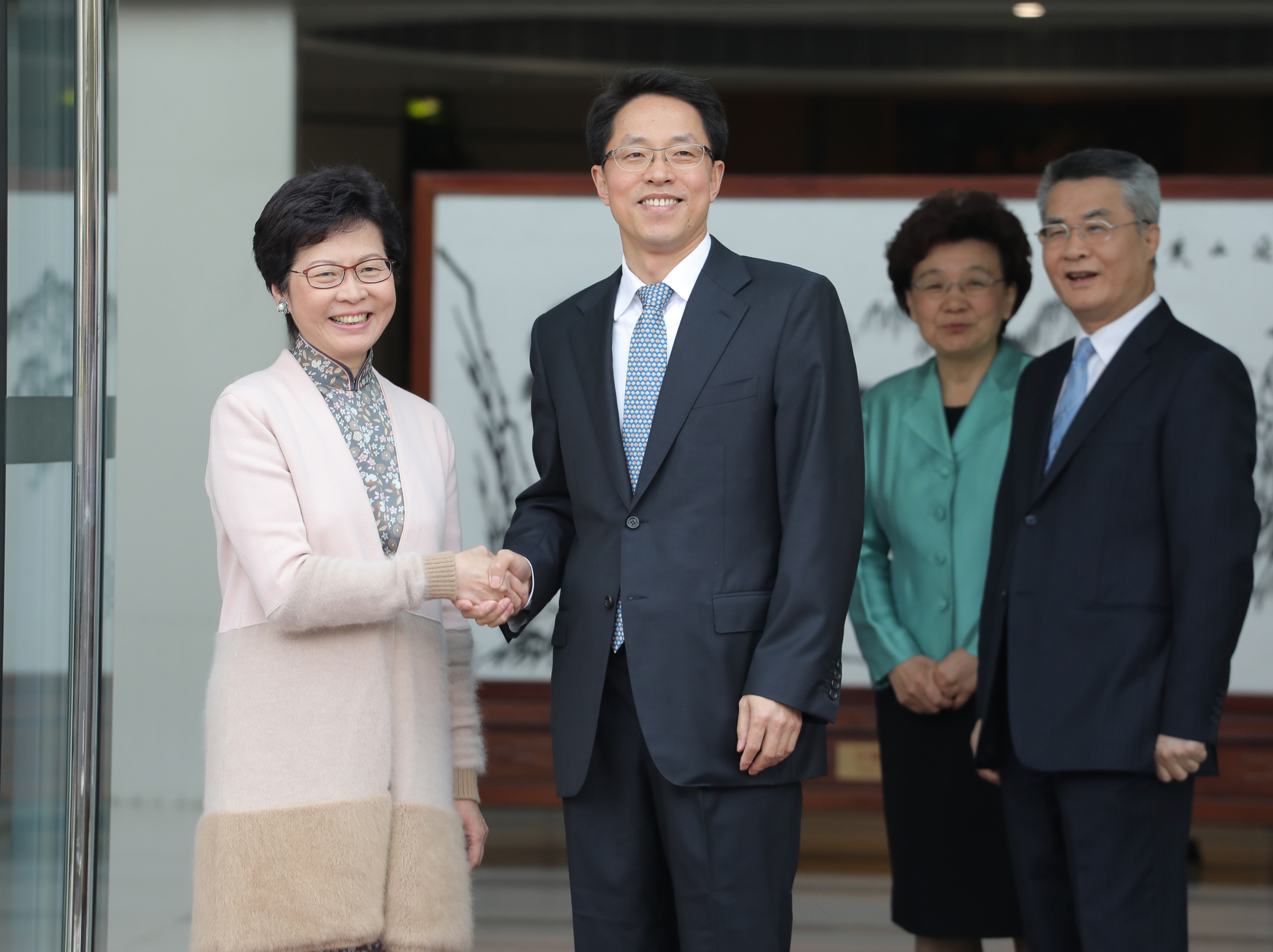 林郑月娥今日(29日)拜访喷鼻港,从任(左二)、副从任黄兰发(左一)和副从任殷晓静(左二)到门口(大公函汇全记者麦钧杰摄)