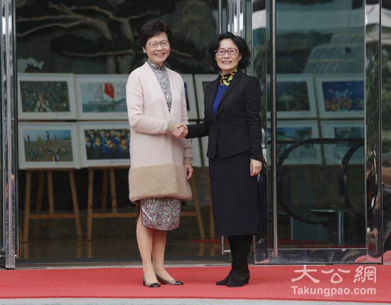 林郑月娥(左)到交际部驻港特派员,拜会代理特派员佟晓玲。大公报记者林少权摄