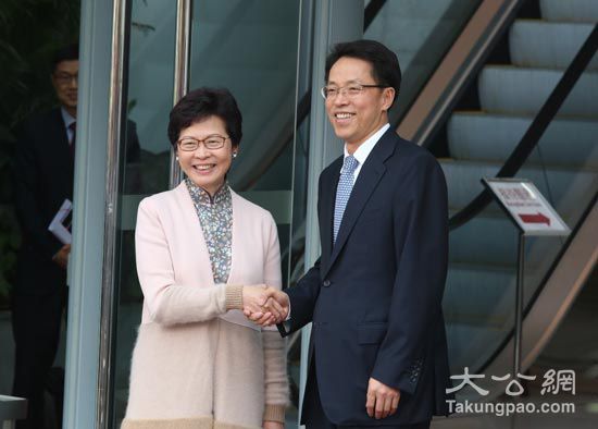 3月29日下战书,林郑月娥拜访喷鼻港。图为喷鼻港从任取林郑月娥握手。大公报记者黄洋港摄