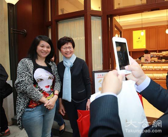 林郑拜访完母校后现身湾仔一家饼店,市平易近争相合照。大公报记者麦润田摄