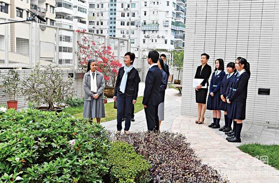 林郑(左二)参不雅由她捐帮成立的花圃。大公报摄
