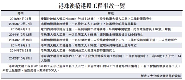 政署称,涉事工地属于港珠澳大桥喷鼻港接线─喷鼻港出格行政区鸿沟至不雅景山段,该工程正正在兴建一条三线双程高架桥,毗连位于喷鼻港出格行政区鸿沟的港珠澳大桥从桥及位于机场岛的不雅景山,工程合约的总承建商是宝嘉─中国港湾─威胜利联营。发生不测的工地位于大澳对出一段近粤港分界的海上高架桥,该段高架桥的布局工程已于早前完成。