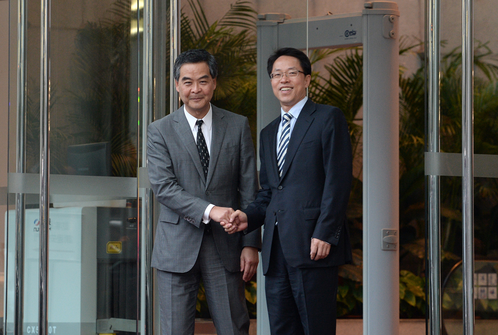 大公网4月6日讯 行政长官梁振英(图左)昨日下战书五时到访,从任(图左)正在门口,两边浅笑握手。梁振英勾留约一个半小时后分开,亲身送至门口,两人再次握手。