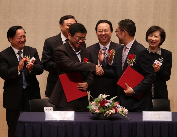 图:副从任谭铁牛(后排左二)、喷鼻港科技园董事局从席罗范椒芬(后排左一)等喷鼻港中科金融科技立异核心签约大公报记者宇摄