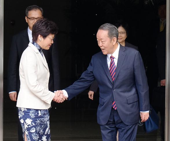 图:林郑分开港澳办时,王光亚取她握手\大公报记者冯瀚林摄