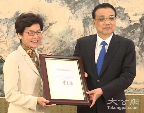 随后,林郑月娥由李克强手上接过国务院录用令,二人同现场取会人士合照。
