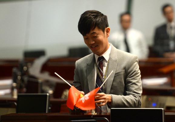 图:郑松泰客岁正在立议事厅公开倒插国旗及区旗,昨日被警方通知控以国旗及区旗罪
