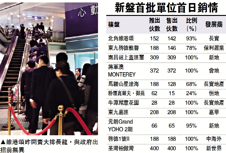 加辣后首个全新发售新盘维港颂,销情完全无受,市场反映磅礴。记者现场曲击,红磡置富城市商场售楼处高峰期起码500人列队,人龙排脚两层楼,围住商场打蛇饼,买家热情如火,墟冚取加辣前无异。维港颂分三组拣楼,市场动静指,三组共逾220枱客出席。