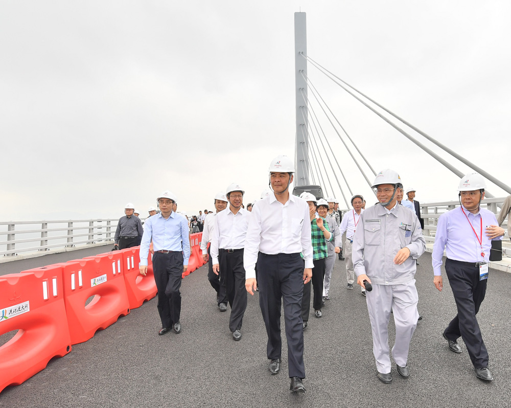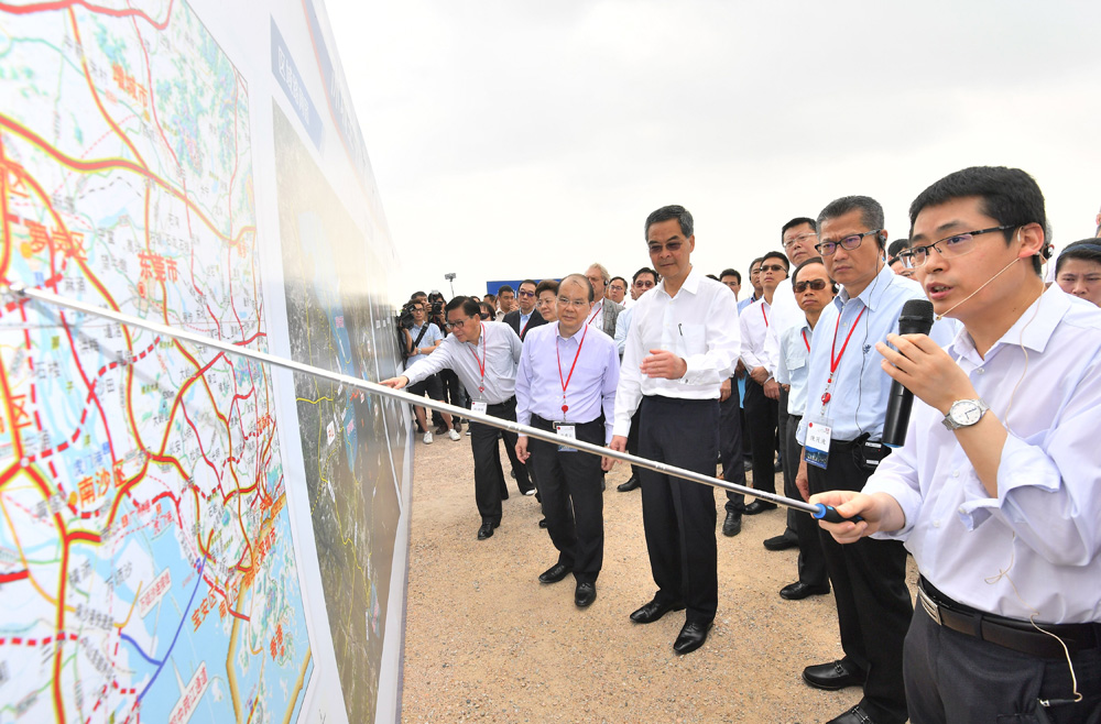 图:梁振英取代表团调查中山市深中通道工程地址,听取相关人员引见最新工程进展