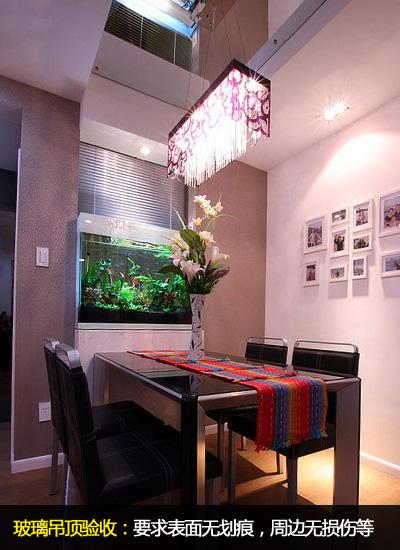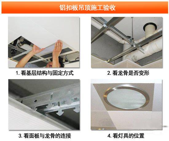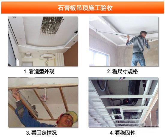 石膏吊顶的验收取金属吊顶的验收大同小异。起首对石膏吊顶的制型外不雅进行,看概况有无起泡、裂痕等;其次吊顶的尺寸规格取设想图能否合适;石膏吊顶公用干壁钉固定,钉头有无涂刷防锈漆;最初吊顶的安定性。
