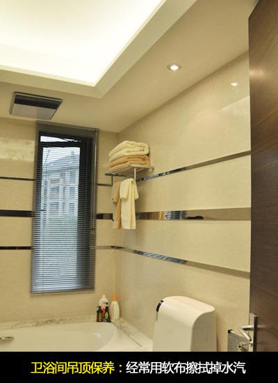 2、卫浴间吊顶的洁净:凡是来说卫浴间没有油渍,好打理清洗。但卫浴间水汽较大,选用卫浴间吊顶的时候,留意选择防水性好的吊顶材料。卫浴间吊顶经常用软布擦拭掉水汽就好了。一般隔一两个月的时间,按时用清洗厨房吊顶的方式来洁净卫浴间吊顶即可。