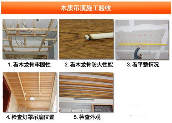 木质天花吊顶的验收有六个步调:起首,查看木龙骨有无瑕疵,龙骨取楼板、吊杆的毗连能否安定;龙骨的防火机能;龙骨的核心能否按短边起拱1/200;灯罩吊扇等能否再承力龙骨架上;最初,查看面板的外不雅能否平整,有无翘脚起皮等现象。