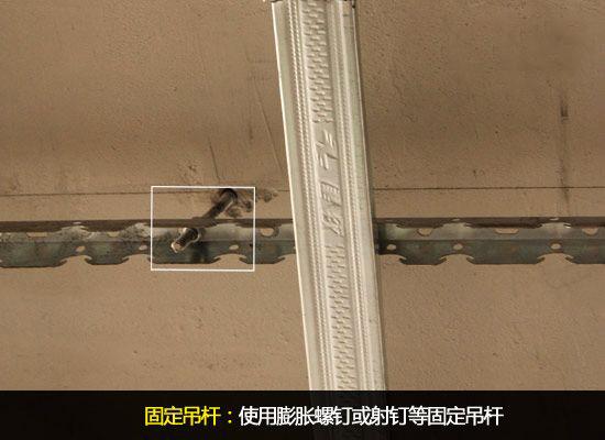 吊顶的吊件,目前利用最多的利用膨缩螺钉或射钉固定角钢块,通过角钢块上的孔,将吊挂龙骨用的镀锌铁丝绑牢正在吊件上。悬吊也能够用伸缩式吊杆。伸缩式吊杆的型式较多,用的较为遍及的是8号铅丝调曲,用一个带孔的弹簧钢片将两根铅丝保持起来,调理取固定次要是靠弹簧钢片。