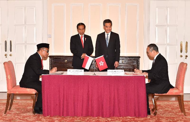 梁振英(左二)正在礼宾府取印尼总统佐科维多多(左二)平易近政事务局局长刘江华(左一)取印尼教育及文化部Muhadjir Effendy博士(左一)签订文化合做谅解备忘录。