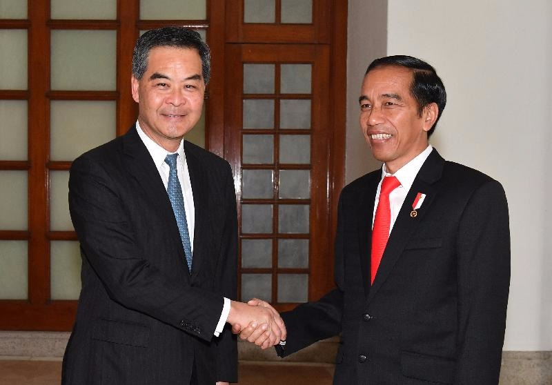 梁振英(左)正在礼宾府取印尼总统佐科.维多多(左)会晤