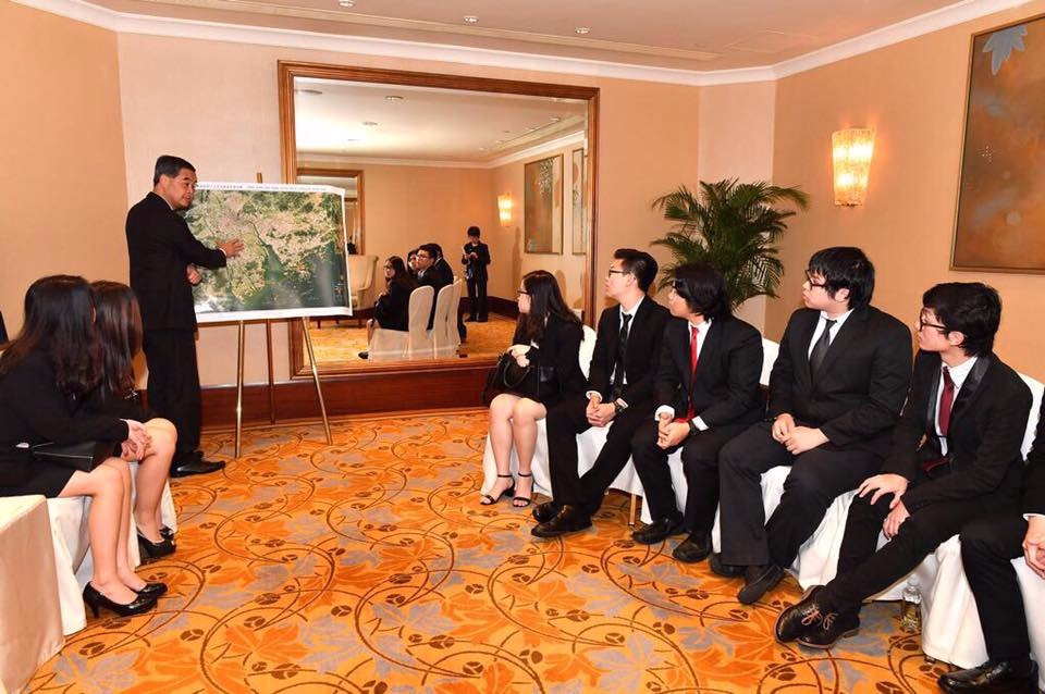梁振英(左上)向正在场学生引见粤港澳大湾区城市群的严沉成长