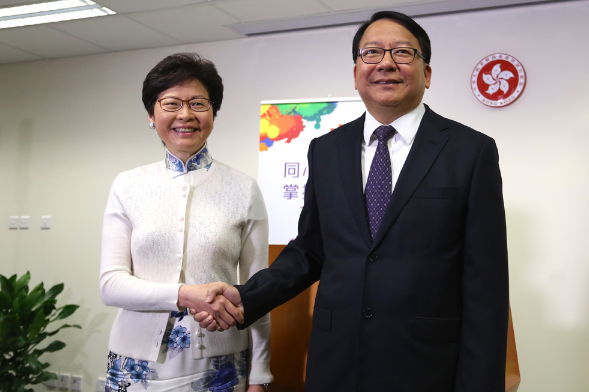 图:林郑月娥(左)描述,陈国基于办事跨越三十年,有心无力有承担,取本人办事港人的分歧\大公报记者何嘉骏摄