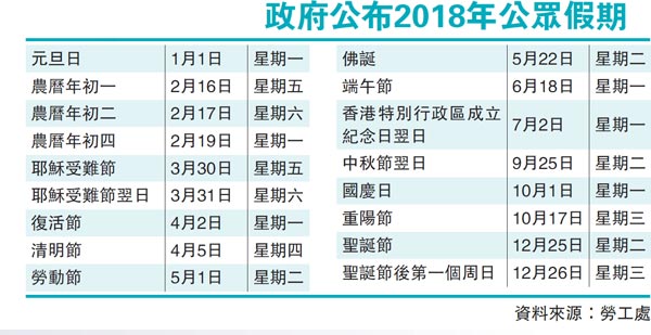刊宪发布2018年公家假期,讲话人说,因为来岁夏历岁首?年月三为日曜日,故夏历岁首?年月四将订为公家假期。别的,因为2018年的喷鼻港出格行政区成立留念日为日曜日,故该天的来日诰日亦将订为公家假期。