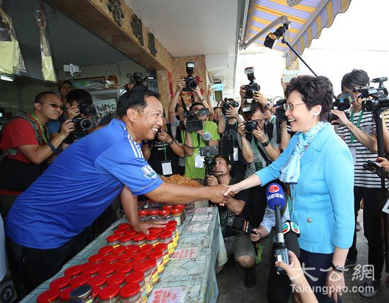 林郑月娥取虾酱店店从亲热握手。大公报记者黄洋港摄