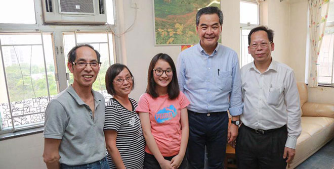 图:梁振英昨沉访淘大花圃,看望曾因沙士而要入住隔离营的曾生曾太一家三口,左一为淘大花圃业委会从席叶兴国