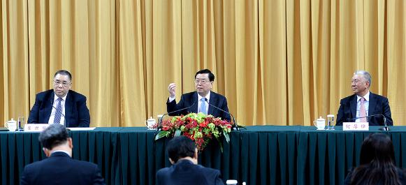 图:全国常委会委员长(中)昨日上午正在澳门东亚活动会体育馆,取澳门社会人士代表座谈,左为崔世安,左为何厚铧\大公报记者林良坚摄