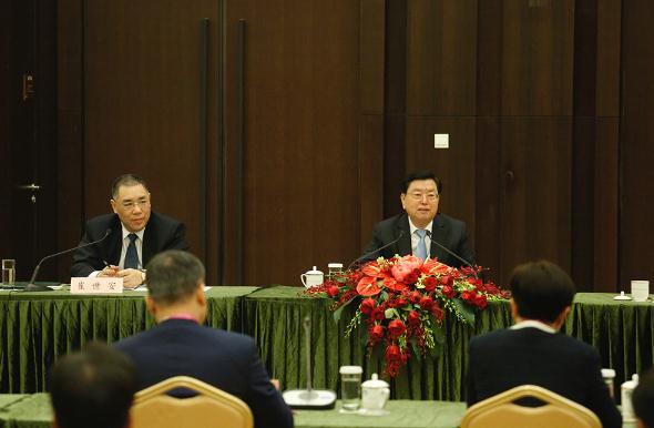 图:委员长(左)昨日取澳门教育界及高校学生代表交换座谈,左为澳门行政长官崔世安\大公报记者曾庆威摄