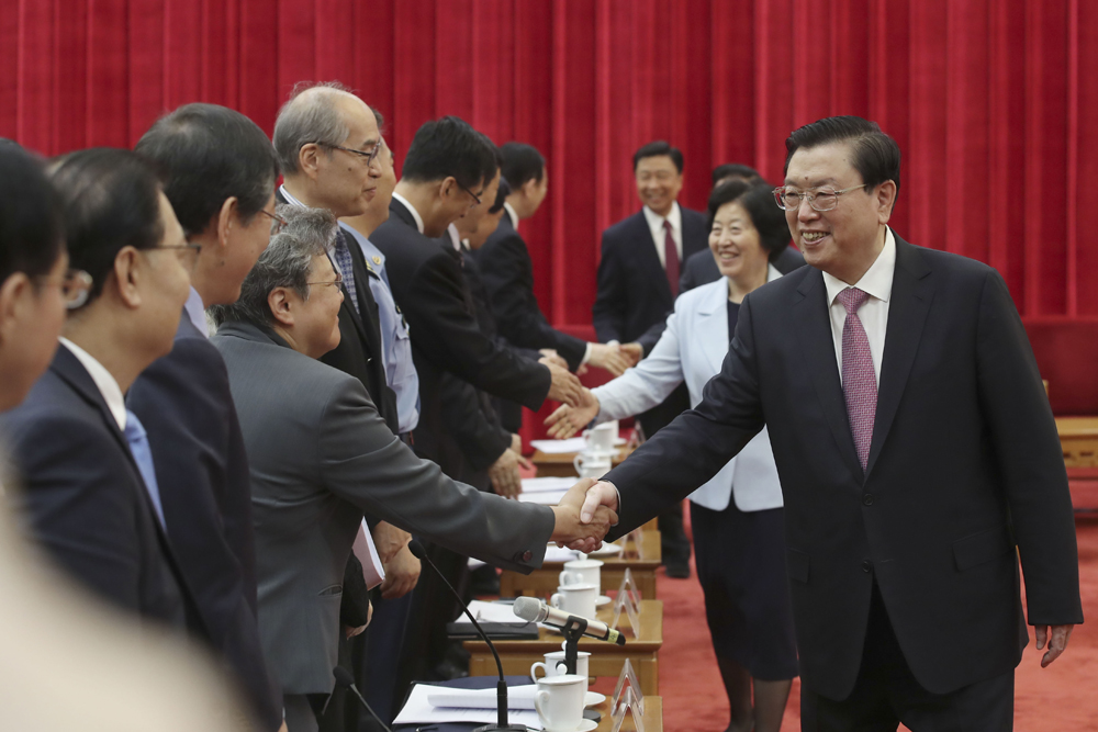 图:全国常委会委员长取出席座谈会人士握手\中新社