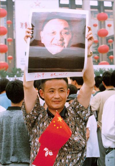 1997年6月30日,喷鼻港即将回归祖国之际,新疆个别户张明正在广场告慰小平同志。李洁军/摄