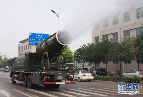 7月7日,多功能抑尘车在河北省张家口市宣化区进行喷雾作业。当日,河北省张家口市首台被称为“雾炮”的多功能抑尘车在张家口市宣化区正式上岗。该多功能抑尘车携带可向空中发射水雾的喷洒系统,能够将水雾喷洒100米远、60米高,达到快速抑制灰尘的目的。陈晓东 摄 图片来源:新华网
