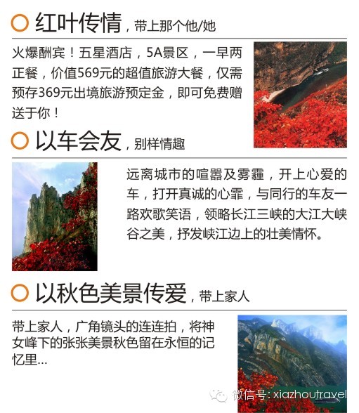 三峡最美是巫山,巫山国际红叶节暨首届峡州自驾车免费旅游月启动啦!亲们,11月15日,两天,和我们自驾巫山看红叶寻秋色好吗?