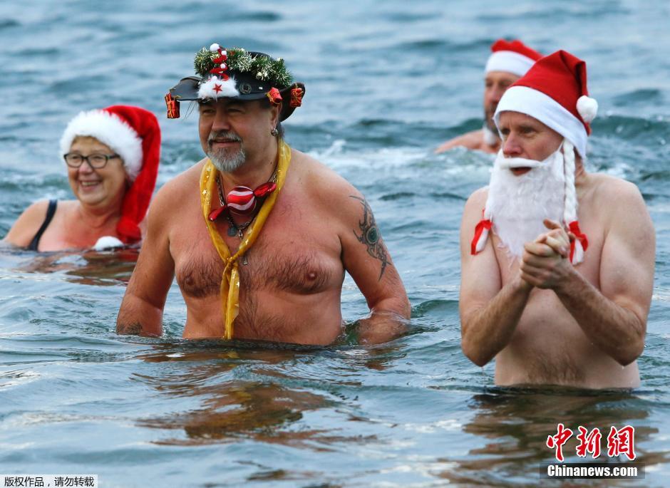 当地时间2014年12月25日,德国柏林,游泳俱乐部“柏林海豹”的成员参加传统的圣诞节冰泳活动。